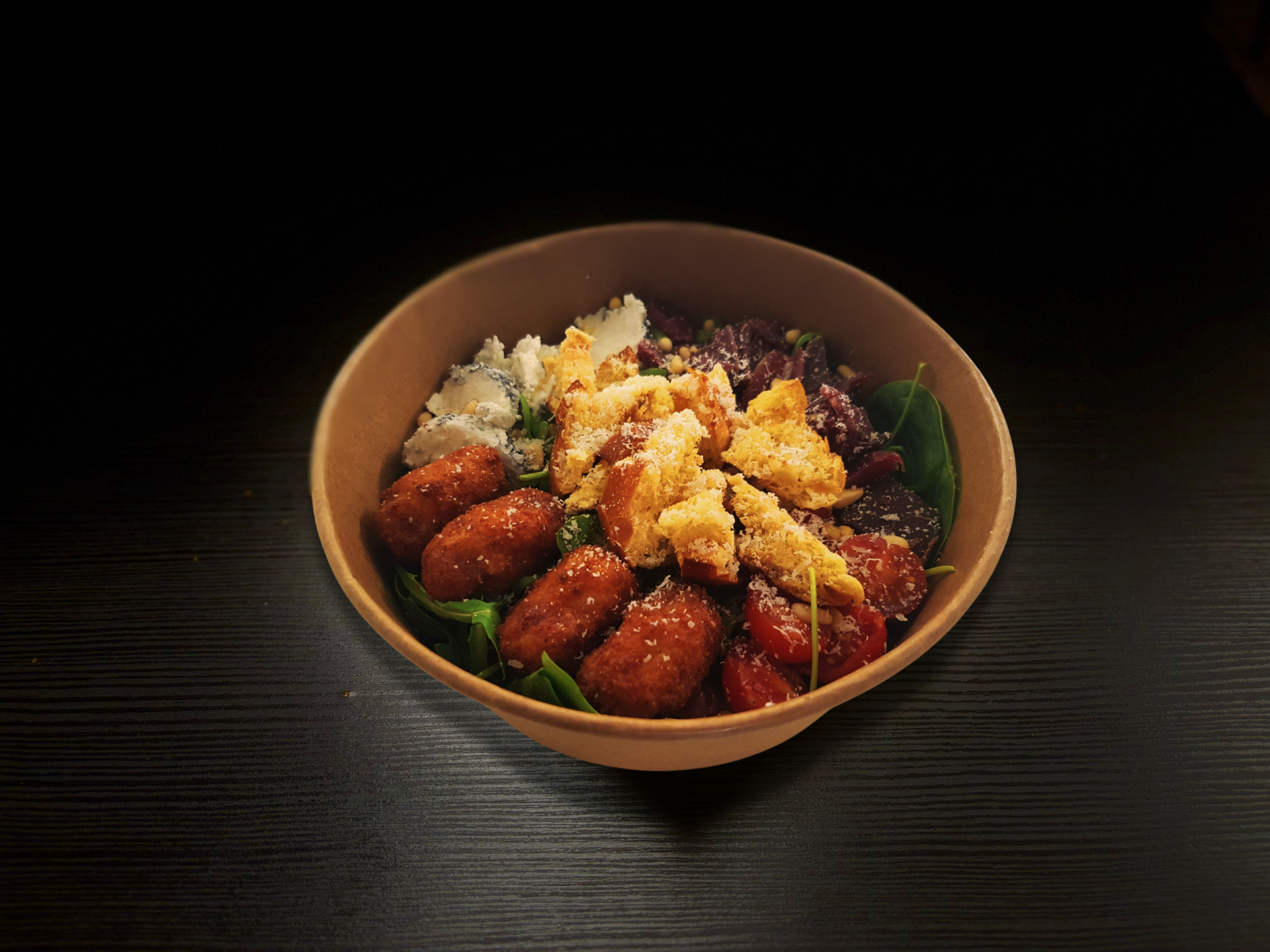 Jeunes pousses de salade, chèvre cendré AOP, tomates cerises, bacon, vinaigrette maison, mini saucisses panées (volaille), parmesan,croûtons.